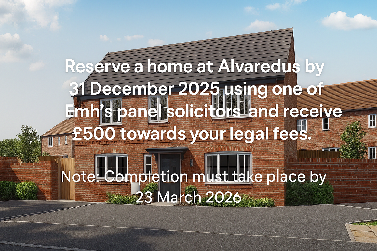*Reserve a home at Alvaredus by 31 December 2025 using one of Emh’s panel solicitors and receive £500 towards your legal fees. Note: Completion must take place by 23 March 2026