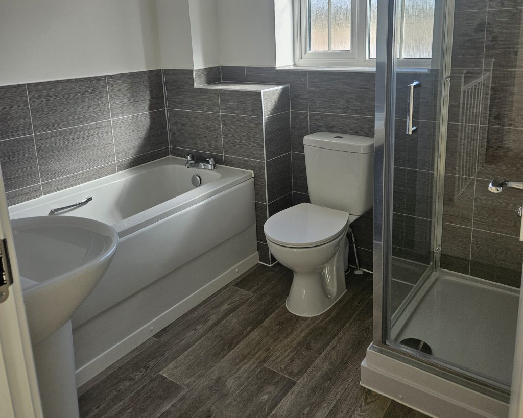 - Family bathroom with shower over the bath and heated chrome towel rail