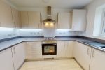 - A fully fitted kitchen with an integrated washing machine, fridge freezer, and a stainless steel oven, hob, and cooker hood.
