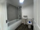 - White bathroom suite with full height tiling around bath